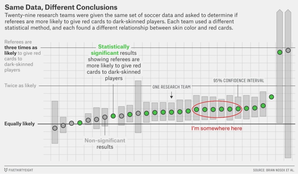 This is the question Nosek and colleagues posed to 29 teams of researchers from a diverse array of research fields. What these authors did were to release a publicly-available dataset of thousands of football players’ records which included a rich array of possible cofounders/covariates such as the height, weight and country of origin of each player. Naturally, the dataset also came with a scale of measuring how “dark-skinned” each player is (on an ordinal scale from 0 to 1 in increments of 0.25) and the number of red cards they were awarded in each player-referee interaction.