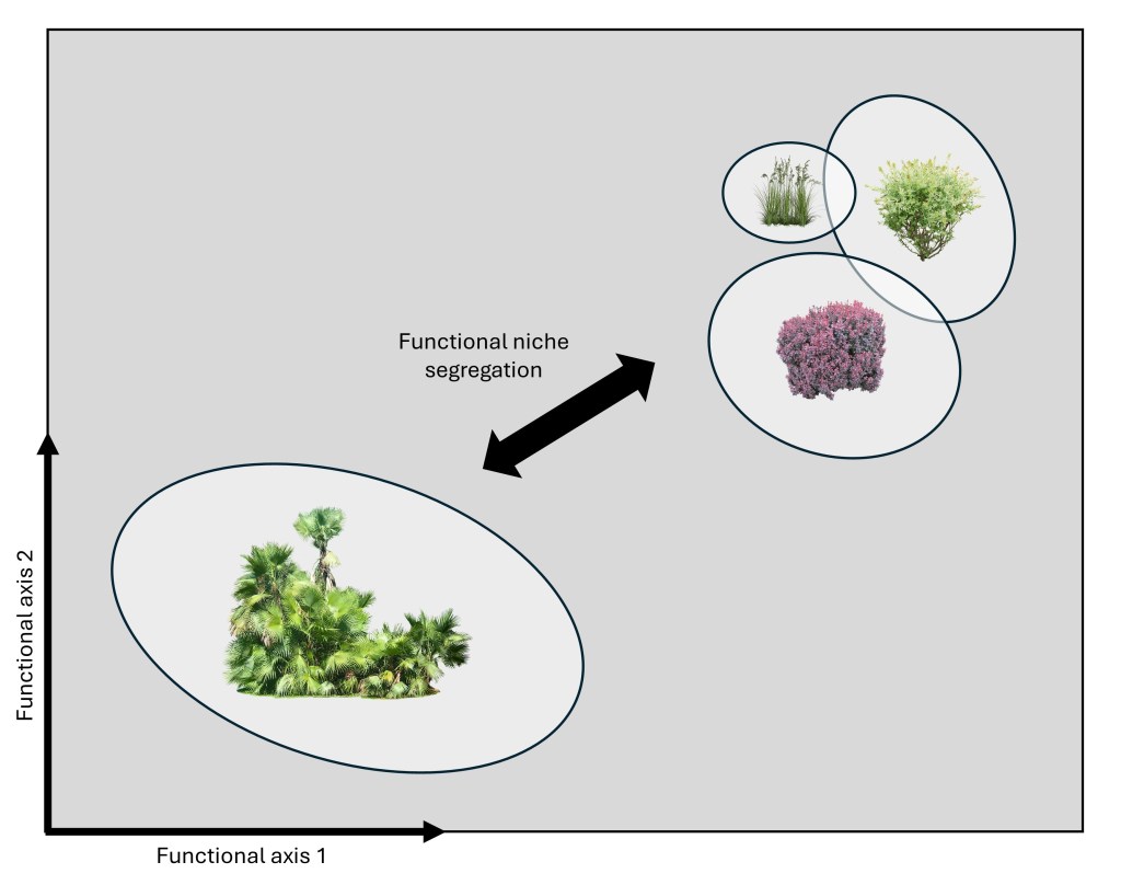 At higher organization levels, the diversity of organisms within ecosystems can now be represented in ways that go beyond the number and ratio of species. For example, the entire space of species’ traits can be represented geometrically as a multidimensional trait space. Functionally similar subsets of species are clustered within a segment of this space, representing a shared “niche” of sorts. Other functionally distinct individuals occupy other parts of the space, effectively reducing niche overlap and facilitating coexistence based on distinct functional niches.