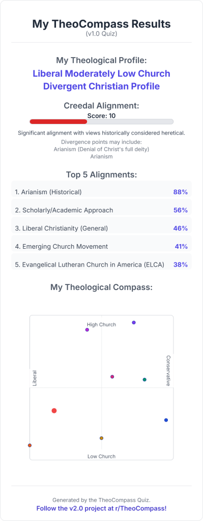 Somewhere on Reddit, Oroq (u/OneBenefit4049) created a really interesting Christian denomination quiz as part of a project called TheoCompass, with the goal of using modern data-driven methods to classify one’s theology along the spectra of beliefs and practices encountered in the history of the faith. While it is a tool made just for fun, it was extremely intriguing to see the options presented in this quiz that highlights just how diverse Christianity is. I recommend people give it a go if you have the time (it’s 63 really intense questions long lol).